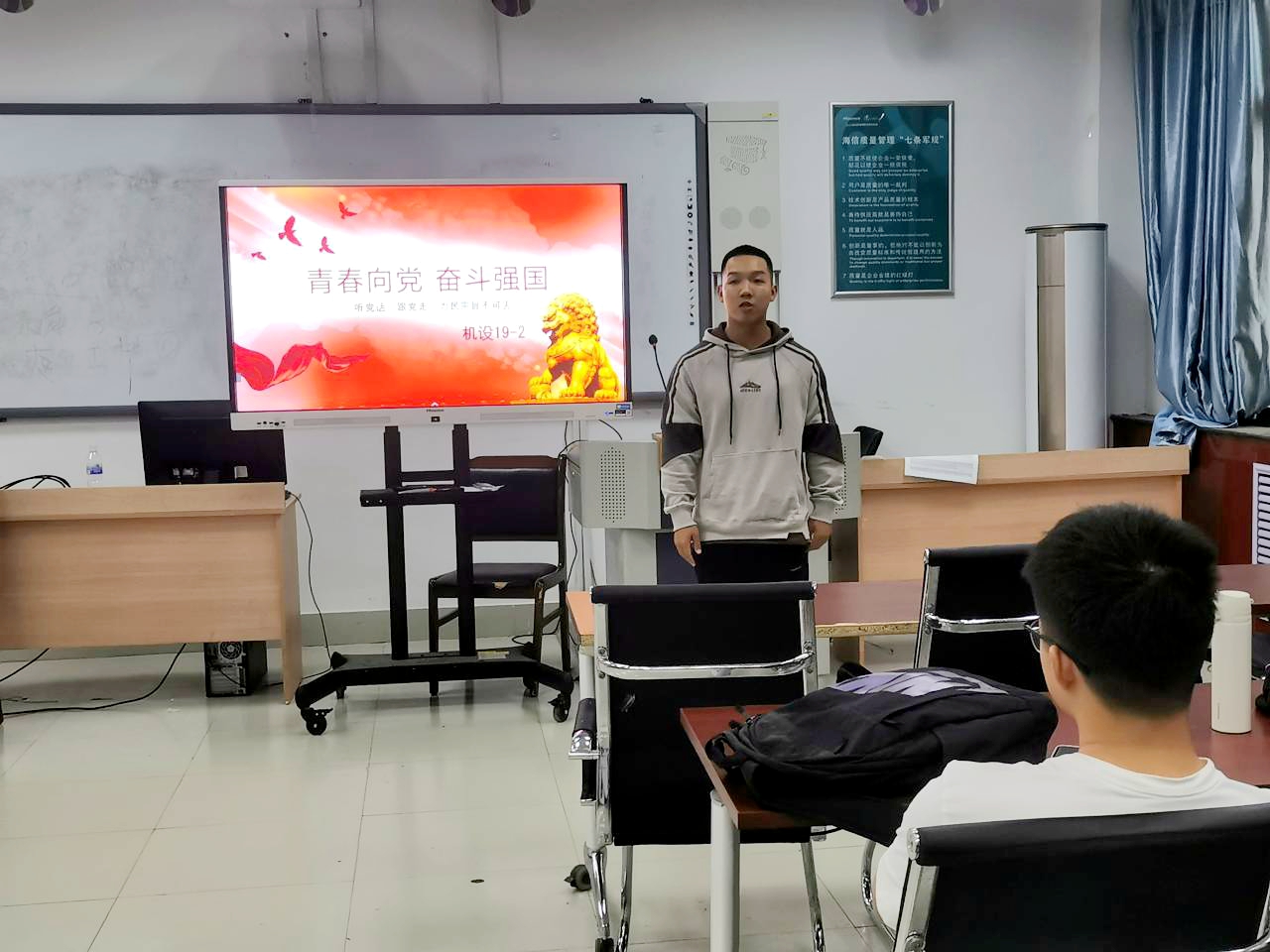 退伍复学学生严利君同学带领机设2019级2班全体同学,统一观看了经典红色影视作品《为了和平》,并向同学们分享了军旅生涯的体会与感悟,进一步增强了班级同学的集体荣誉感。