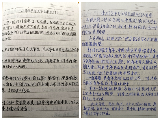 干净书页上一行行、一段段的标画,语段两边字迹娟秀整齐的注解和感悟,逻辑清晰、内容丰富且感情饱满的读后感……体现了同学们对《习近平与大学生朋友们》一书的认真研读之态、思考感悟之深、切实喜爱之情。
