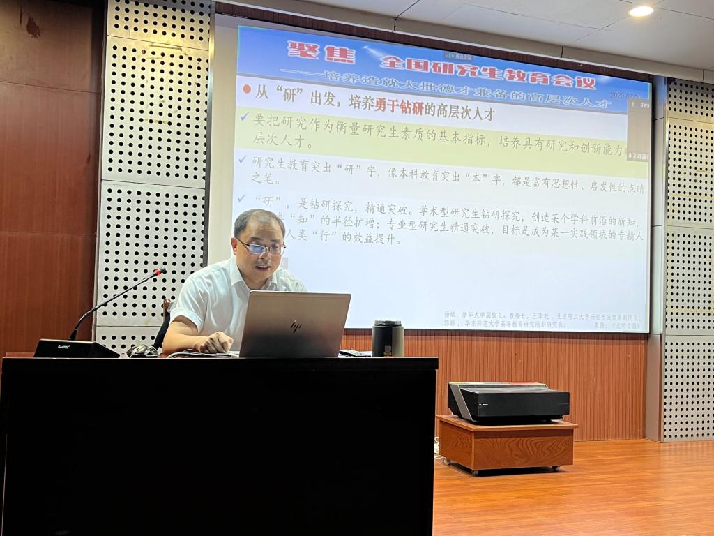 为构建和谐共进的师生关系,建设以辅导员和导师为主的研究生思想政治教育队伍,研究生辅导员王玉鹏老师为2022级研究生新生开展了导学思政教育线上讲座。导学关系作为研究生阶段的核心社会关系,存在于导师与学生的双向互动过程中,既深刻影响着研究生的求学历程,又作为一种“师承”关系贯穿于导师和学生的生涯始终。研究生群体相较于本科生群体思想更为成熟、社会角色更为多元,在重视课堂这一核心育人载体的同时,要立足于导学关系,构建符合新时代研究生特点的“导学思政”体系,王玉鹏强调要夯实全员育人、全过程育人和全方位育人的“三全育人”的工作体系,更加有针对性地调整和创新研究生培养模式,实现育人效果最大化。